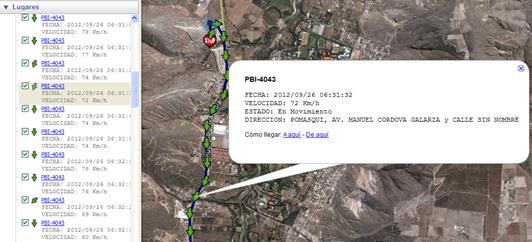 GOOGLE EARTH: Esta opción permite exportar los reportes en el formato KML (GOOGLE EARTH), en el reporte se desplegara los icono indicando los diferentes estados que tuvo el vehículo, al dar click sobre el icono se desplegara una ventana de información indicando fecha , hora, velocidad, estado y la dirección.