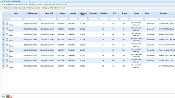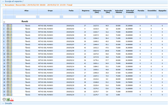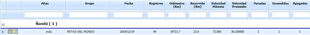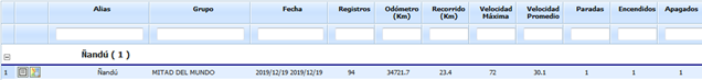 Registro, Odómetro, Recorrido, Vel. Máxima, Vel. Promedio, Paradas, Encendidos,