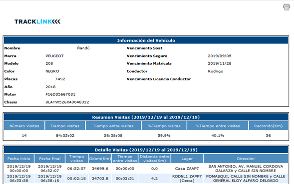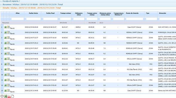 Inicio, Fecha Final, Tiempo Visitas, Odómetro (KM.), Tiempo entre Visitas,