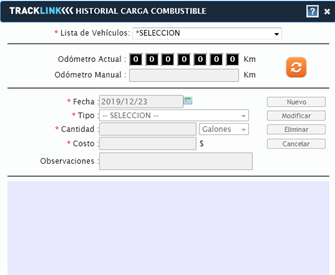 Se desplegara la siguiente ventana, en la cual se debe seleccionar el vehículo e ingresar los siguientes datos fecha, tipo de combustible, cantidad, medida, costo son campos obligatorios