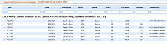 Las columnas que se despliegan en el reporte son Alias de vehículo, fecha de registro, tipo de combustible, cantidad, medida, costo, el mínimo odómetro del vehículo en la fecha que se registro la carga de combustible, recorrido (se calcula entre los valores de la columna mínimo odómetro.