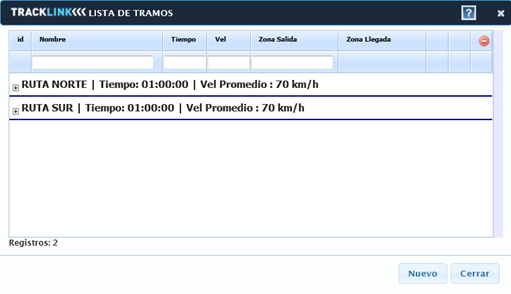 Al dar click sobre esta opción se desplegara la siguiente ventana, en la cual se podrá visualizar todos los trayectos ingresados con todos los tramos correspondientes, en la parte superior se visualizara un resumen con el nombre del trayecto, tiempo (sumatoria de los tiempos de los tramos), velocidad promedio (sumatoria de las velocidades de los tramos)