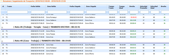 En la pestaña de reportes rápidos se agregó la opción seguimiento de transporte, al obtener el reporte se desplegara la información del trayecto con los tramos cumplidos (salida e ingreso de zona), en la parte superior se desplegar un resumen con el alias de vehículo, nombre de trayecto, transito efectivo (sumatoria del tiempo de todos los tramos menos el tiempo de paradas permitidas y las paradas del vehículo en los tramos)