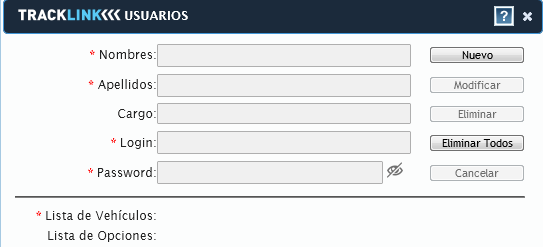 · Los campos con (*) son obligatorios, el campo cargo y lista de opciones no son obligatorios, si no se selecciona ninguna opción de la lista por defecto solo se habilita al navegar en el mapa, zoom, alejar, restablecer el tamaño, mapas de Tracklink, mapas de google, imprimir y ayuda.