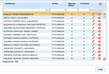 Se desplegara la siguiente ventana, con la lista de todos los conductores previamente ingresados y la fecha de caducidad de la licencia de conducir
