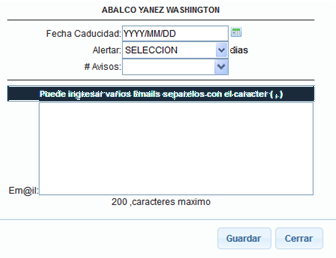 En la cual se debe ingresar la fecha de caducidad en el caso que no fuera registrada anterior mente, los días de anterioridad con los que van a llegar las alertas, el número de avisos o veces que van a llegar las alertas y el email o emails a los que van a llegar la alerta.