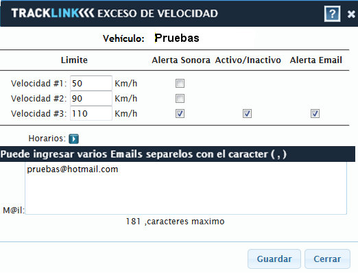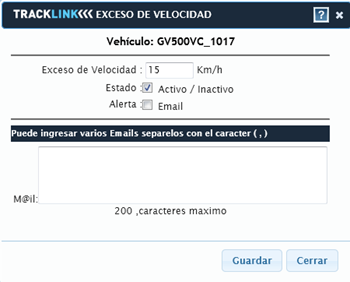 NOTA: Solo se podrá programar un exceso de velocidad a la vez. Y la velocidad debe ser mayor o igual a 40 km/h y menor a 180 km/h.