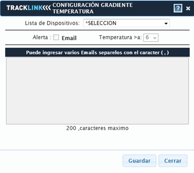 Al dar click en el botón Nuevo se desplegara la siguiente ventana, en la cual se debe seleccionar el dispositivo, se debe activar la opción de Alerta, seleccionar la temperatura e ingresar el o los emails
