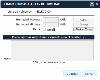 Al seleccionar el vehículo se activaran los campos de Humedad Máxima, Mínima, Alerta y email.