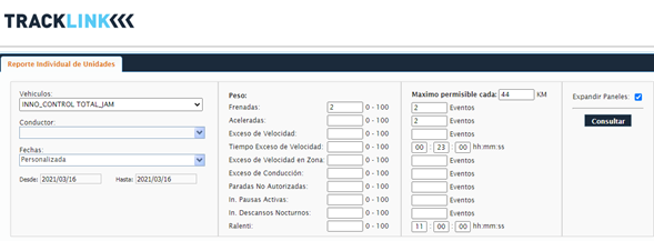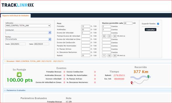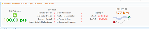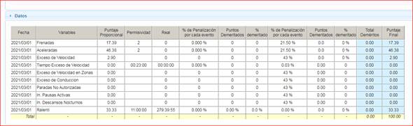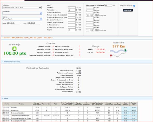 Este reporte permite obtener la calificación o puntaje en base al peso de los siguientes parámetros Frenadas, Aceleración, Exceso de Velocidad, Ralentí