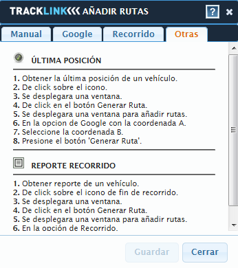 Me permite crear rutas de dos maneras una es cuando se obtiene la última posición del vehículo y ahí me dan las instrucciones para generar la ruta, y la otra opción es cuando obtenemos el reporte de recorrido y me dan las instrucciones para generar la ruta.
