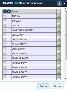 Nota: Al momento de borrar las zonas, si fue convertido de cerca a zona se eliminar solo la zona y la cerca seguirá intacta pero en el listado de las cercas cambiara el icono.