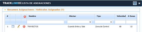 Al seleccionar la opción se desplegara la siguiente pantalla, en la cual se presenta de manera resumida todos los vehículos asignados a puntos de interés, rutas o zonas.