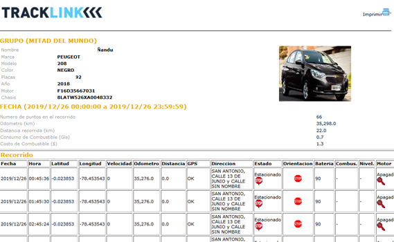 GOOGLE EARTH: Esta opción permite exportar los reportes en el formato KML (GOOGLE EARTH), en el reporte se desplegara los icono indicando los diferentes estados que tuvo el vehículo, al dar click sobre el icono se desplegara una ventana de información indicando fecha , hora, velocidad, estado y la dirección.